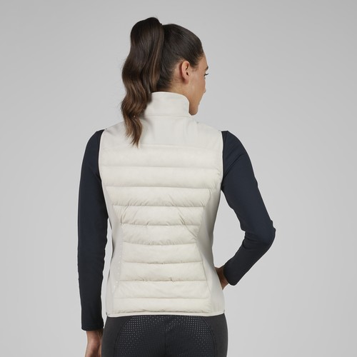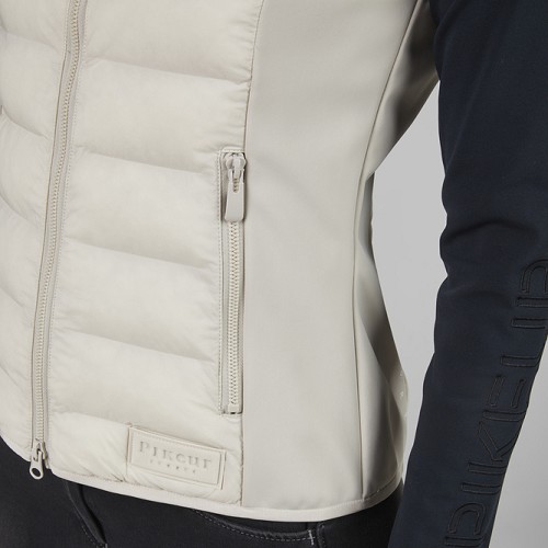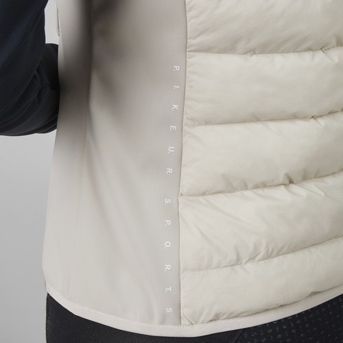 軽量ハイブリッドベスト。2wayジップ+ジップポケット。裾に立体ロゴラベル。肩と背面にさりげないロゴプリント。