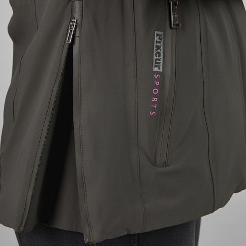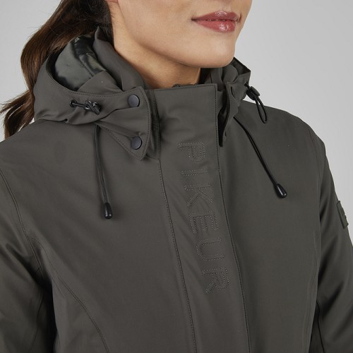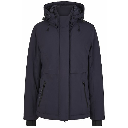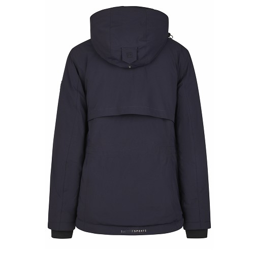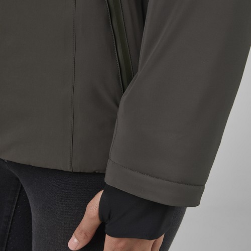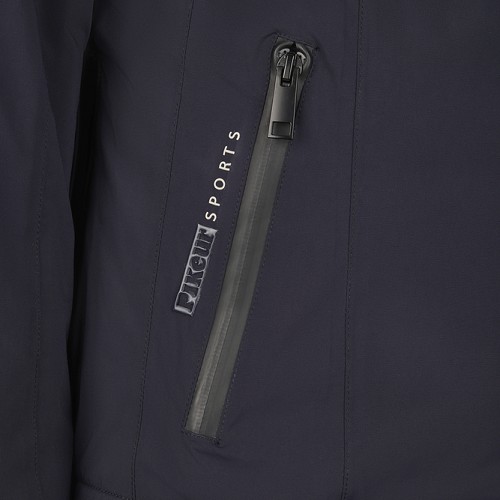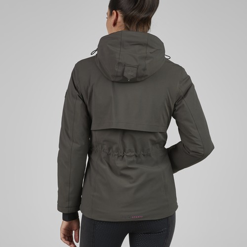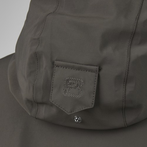 ウォータープルーフジャケット。裾の丈は後ろ下がり。裾の両サイドはジップスリット&裏地付きで騎乗時に便利◎前後ヨークはメッシュ生地切替。ウエスト部分サイズ調整可。フード&ポケット&襟元にエンボスロゴ刺繍。フードはマグネットで固定可&コードでサイズ調整可&取り外しOK!