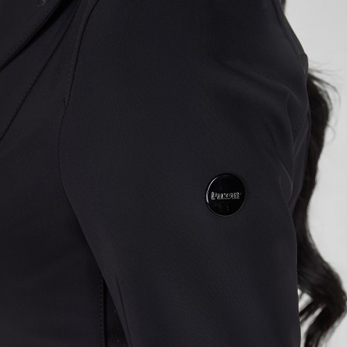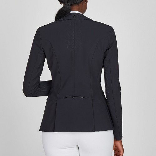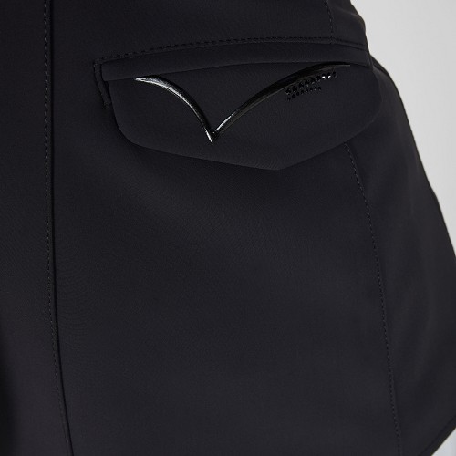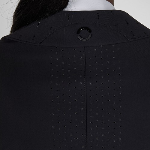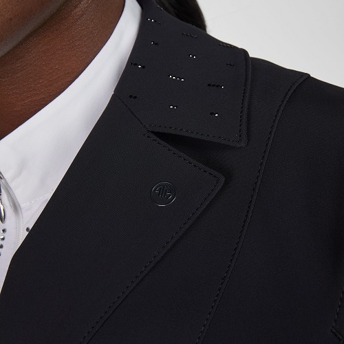 定番人気のISALIEをアップデート!ボンデッド高機能ジャージー生地。襟全体に華やかなラインストーン装飾。